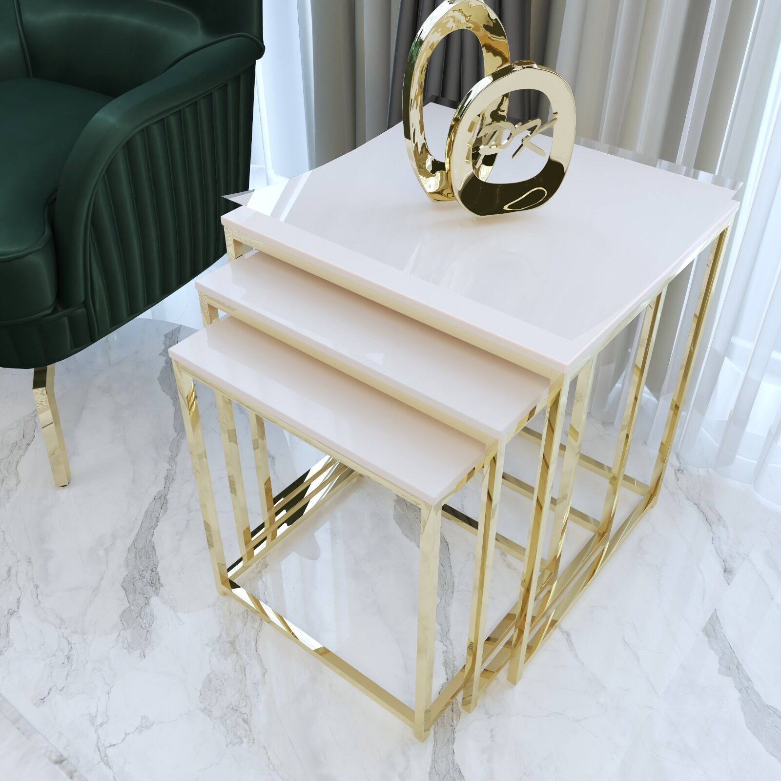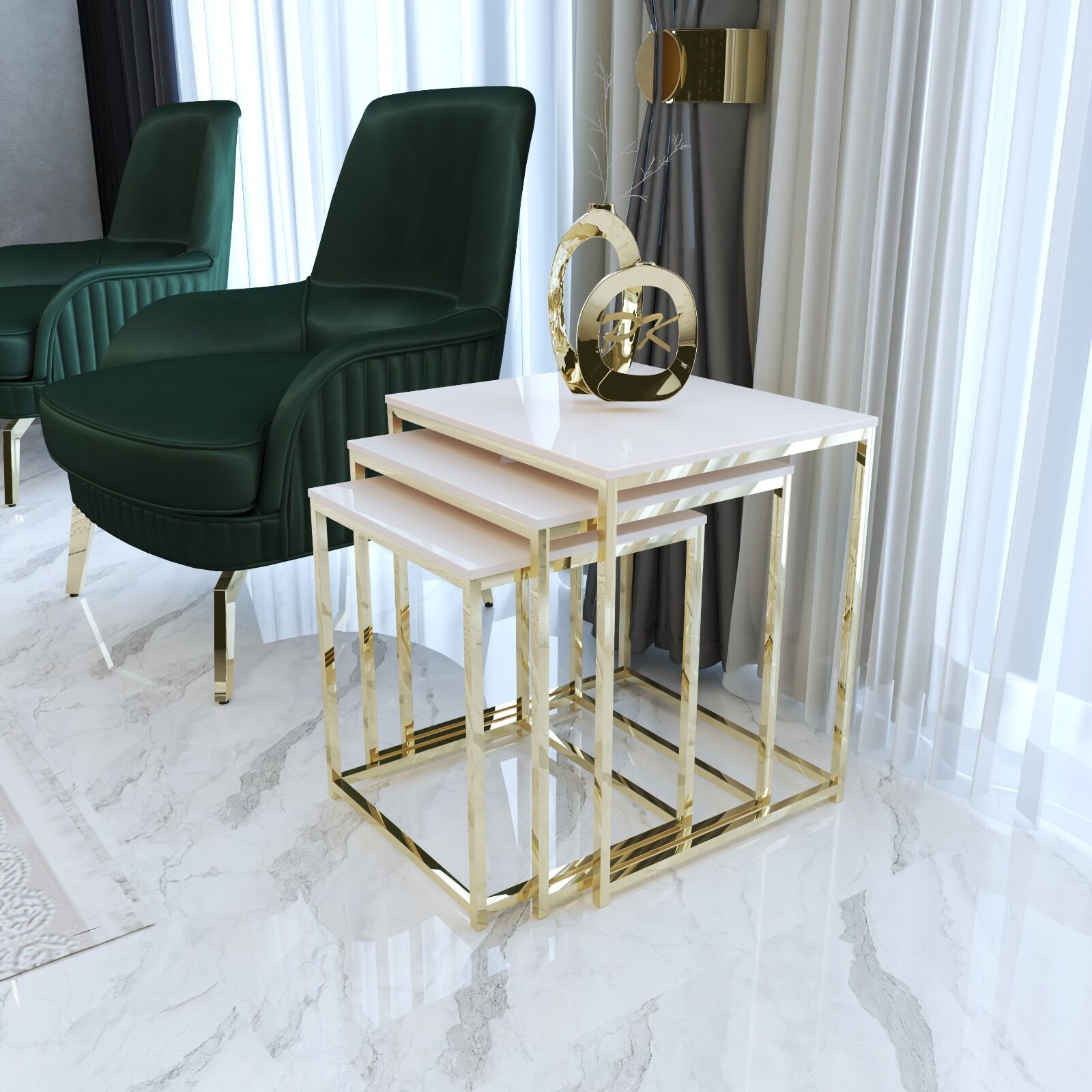 Duru 3'lü Kare Zigon Sehpa Seti Gold Ayak, Krem Mdf