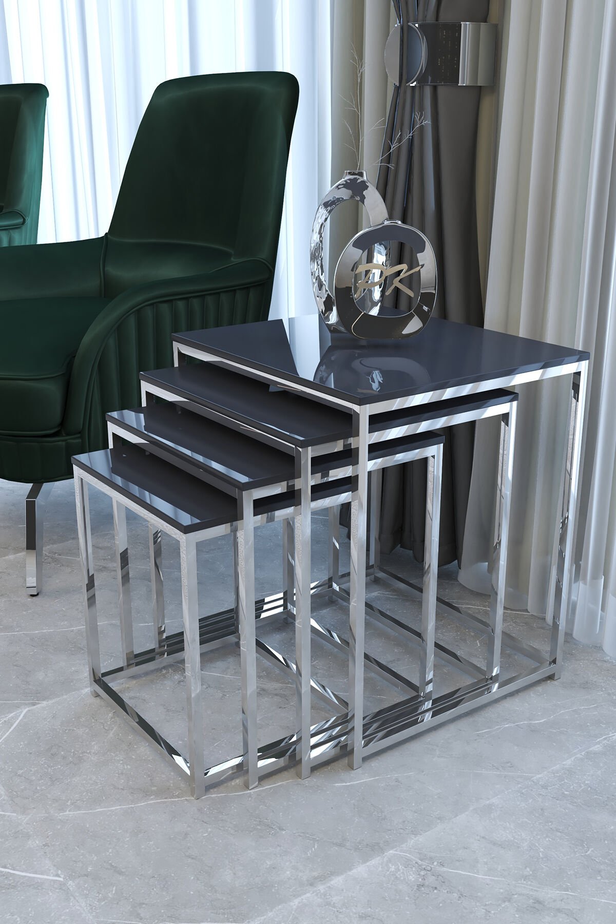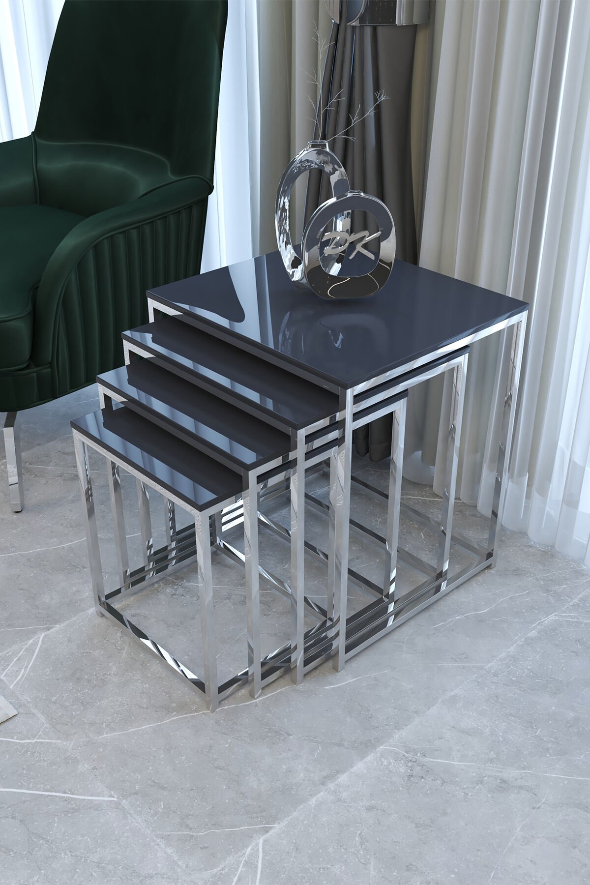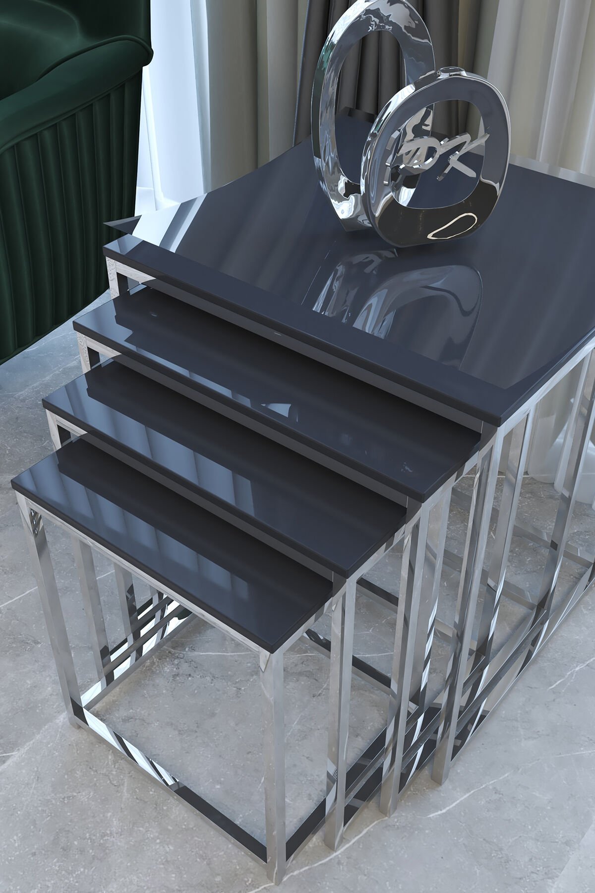 Duru 4'lü Kare Zigon Sehpa Seti Gümüş Ayak, Antrasit Parlak Yüzey Mdf