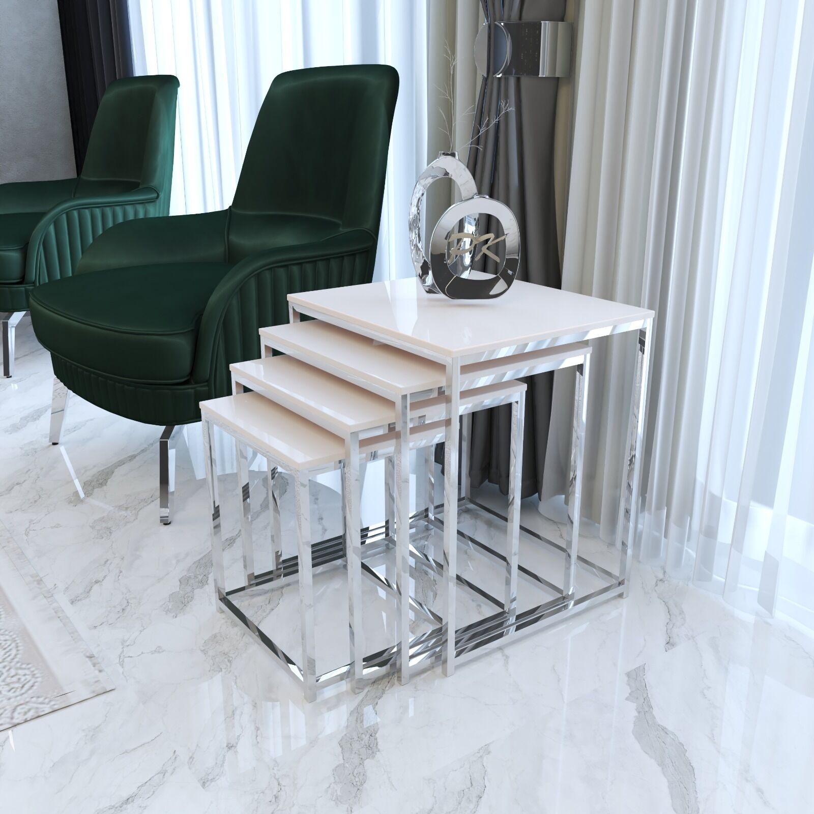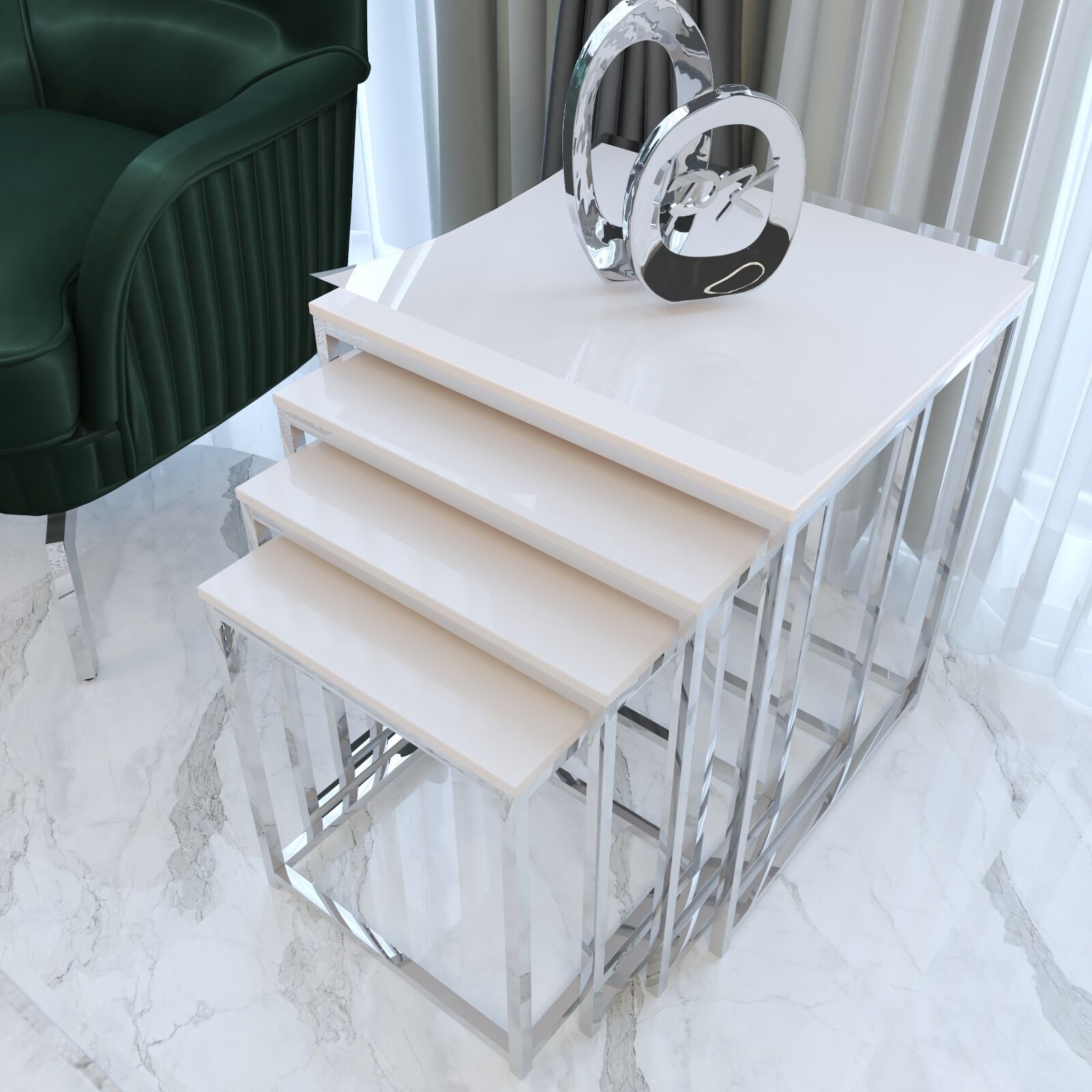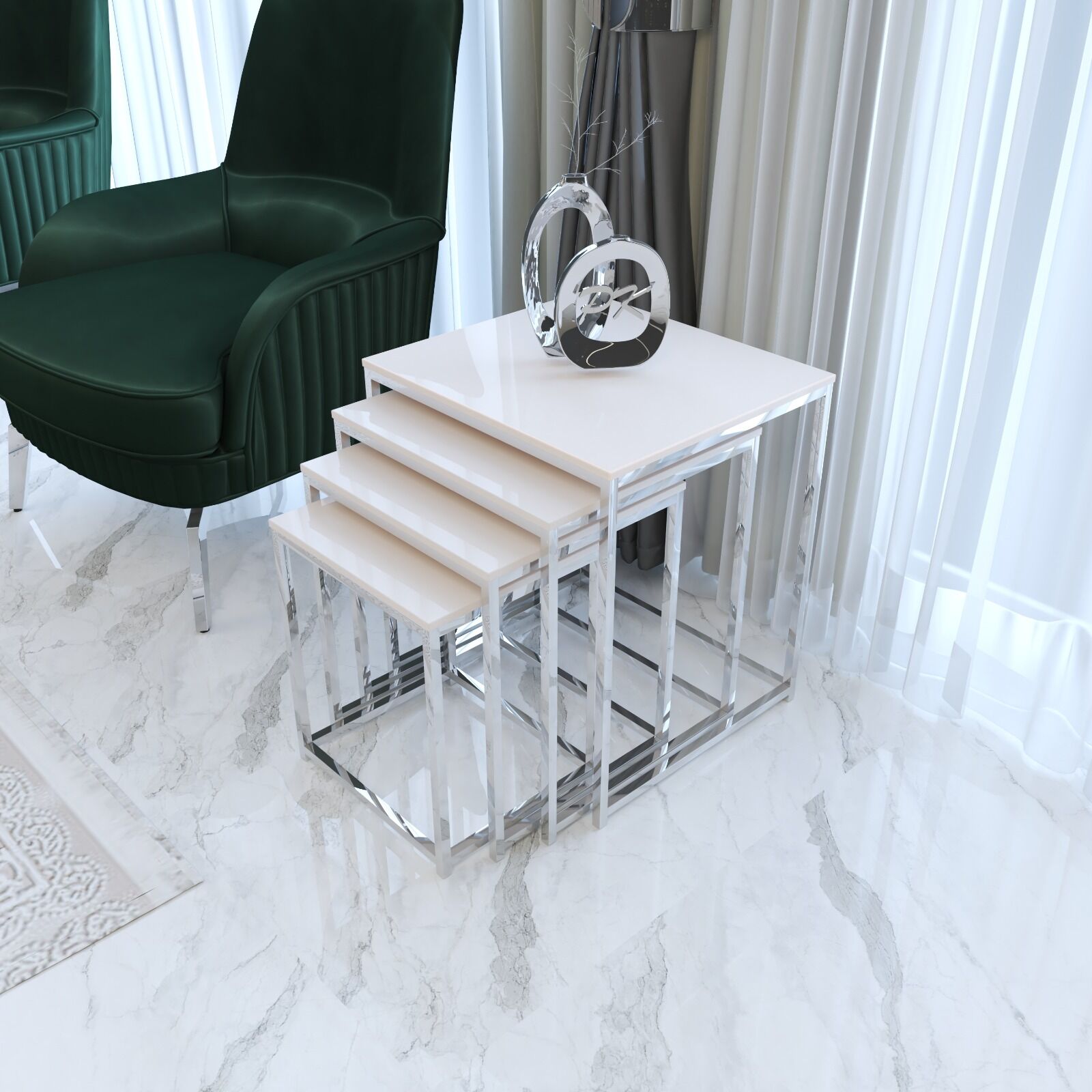 Duru 4'lü Kare Zigon Sehpa Seti Gümüş Ayak, Krem Mdf