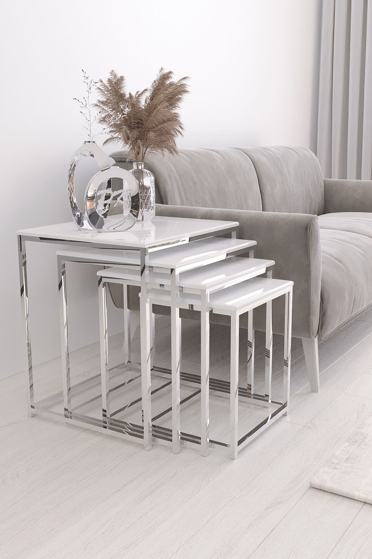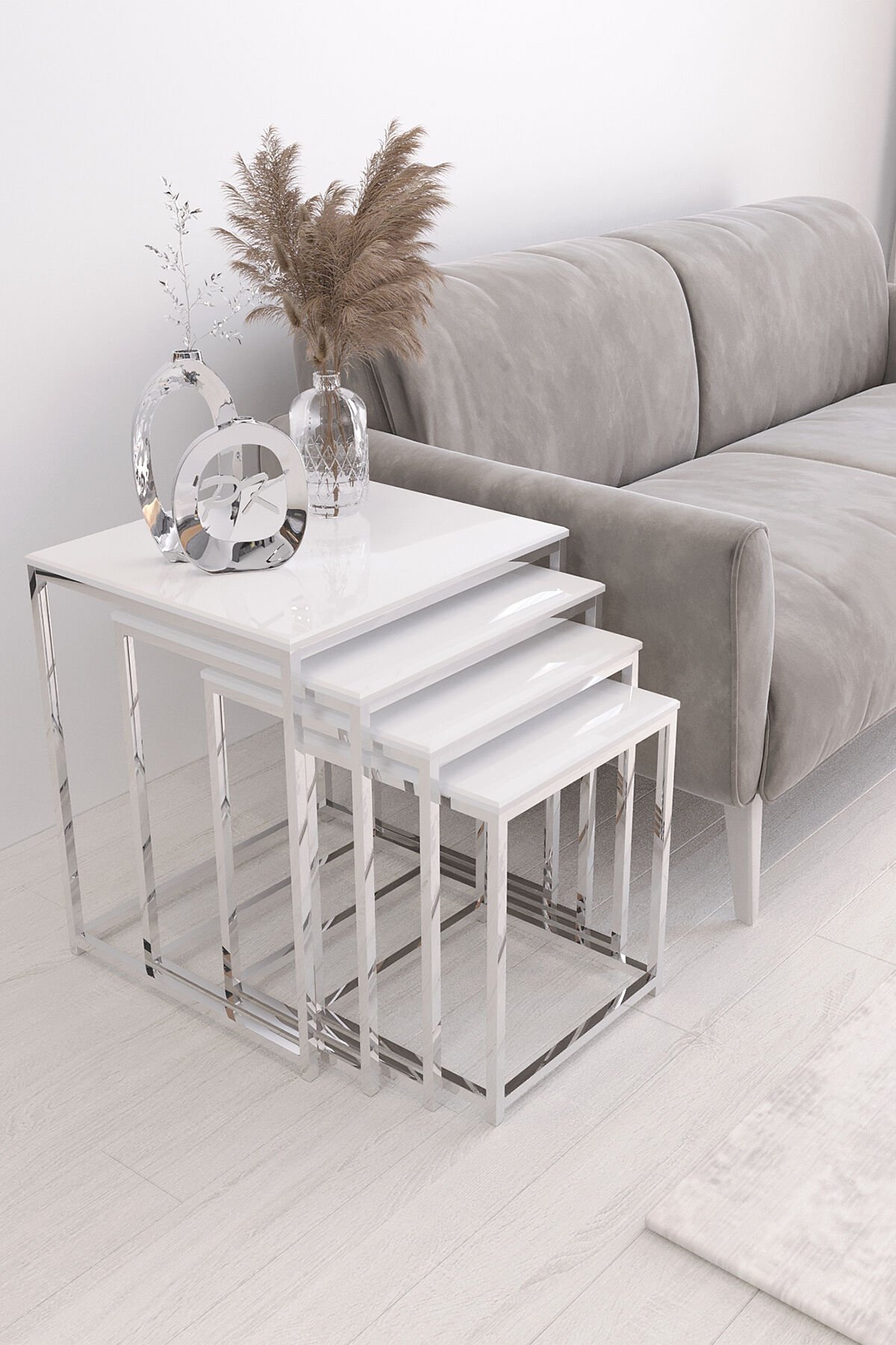 Duru 4'lü Kare Zigon Sehpa Seti Gümüş Renk Ayak, Beyaz Parlak Yüzey Mdf