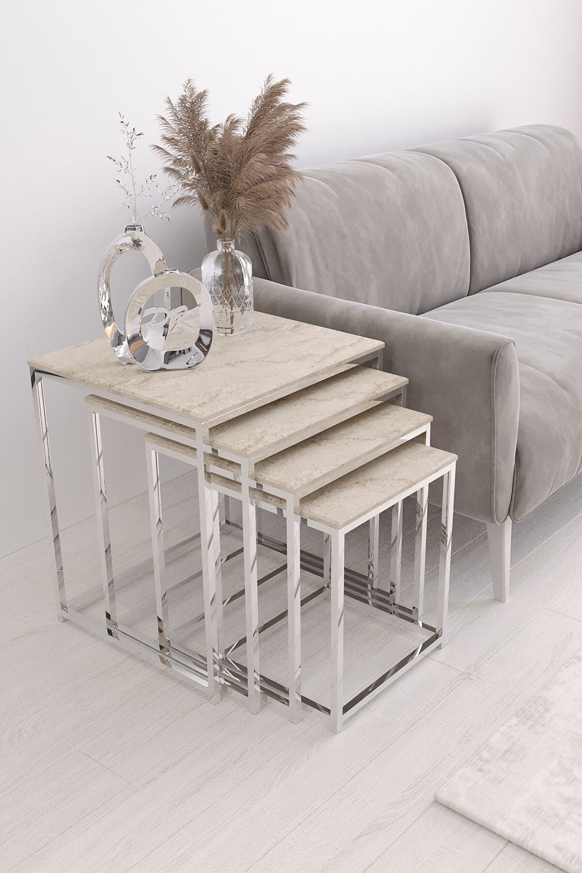 Duru 4'lü Kare Zigon Sehpa Seti Gümüş Renk Ayak, Traverten Mdf