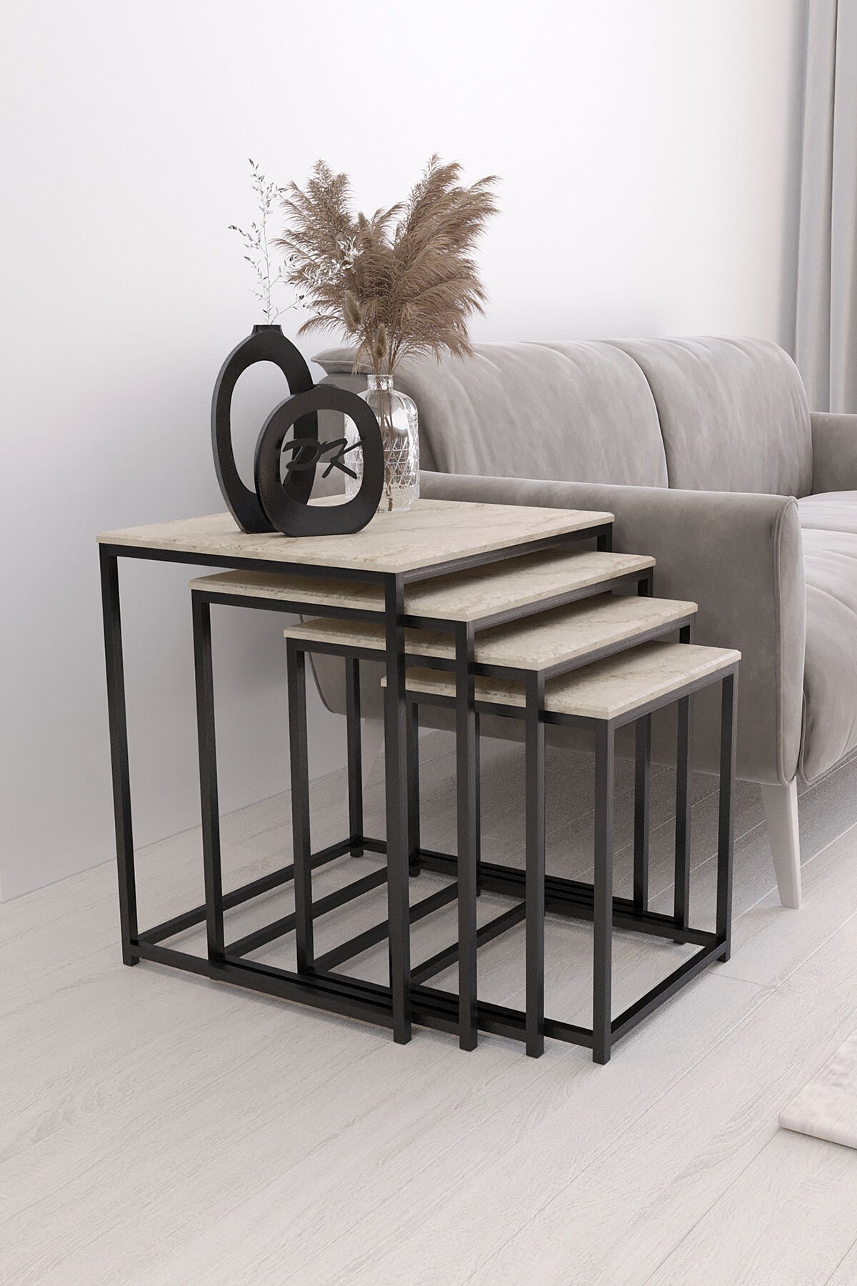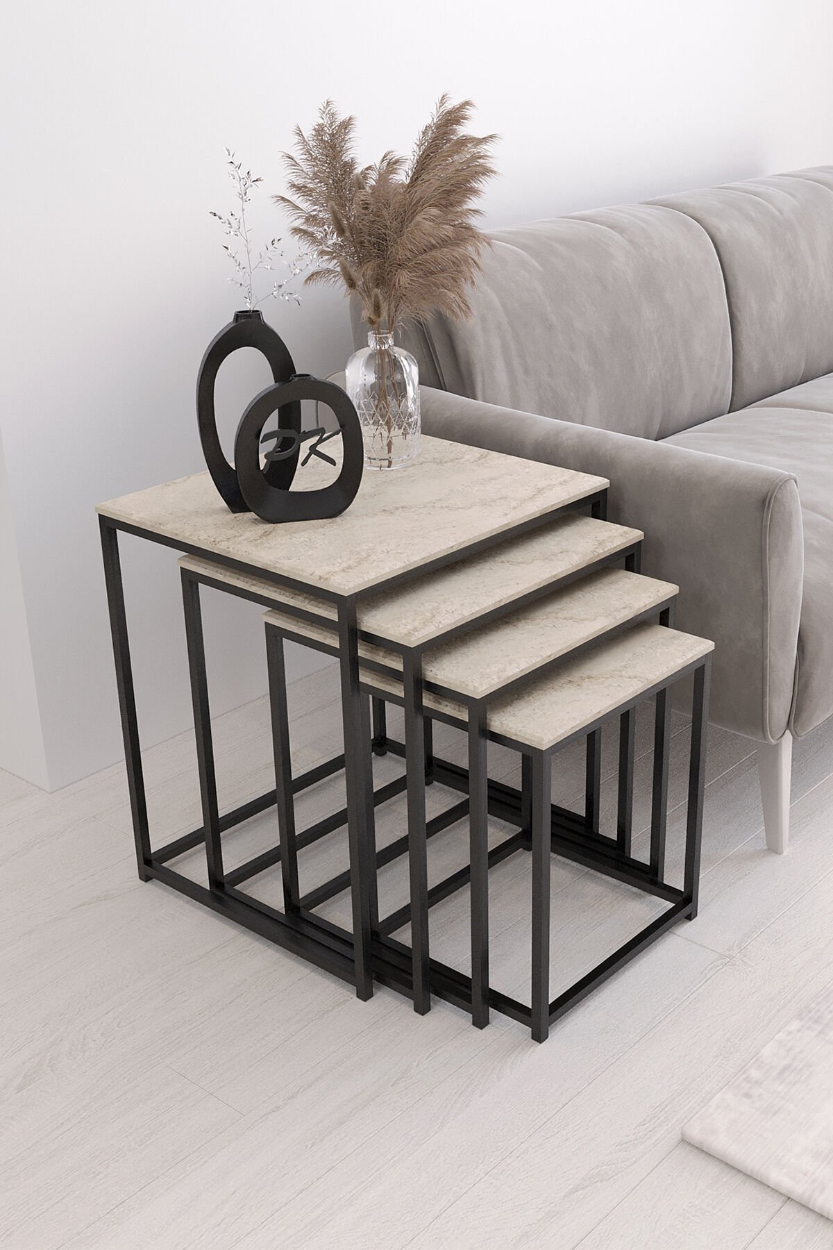 Duru 4'lü Kare Zigon Sehpa Seti Siyah Renk Ayak, Traverten Mdf