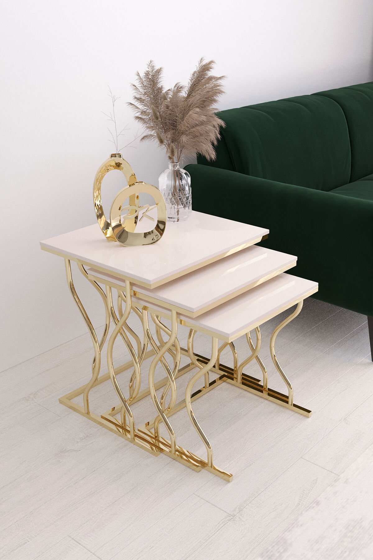Hayal 3'lü Kare Zigon Sehpa Seti Gümüş Ayak, Krem Mdf