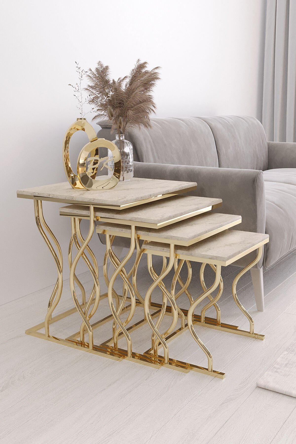 Hayal 4'lü Kare Zigon Sehpa Gold Ayak, Traverten Mdf