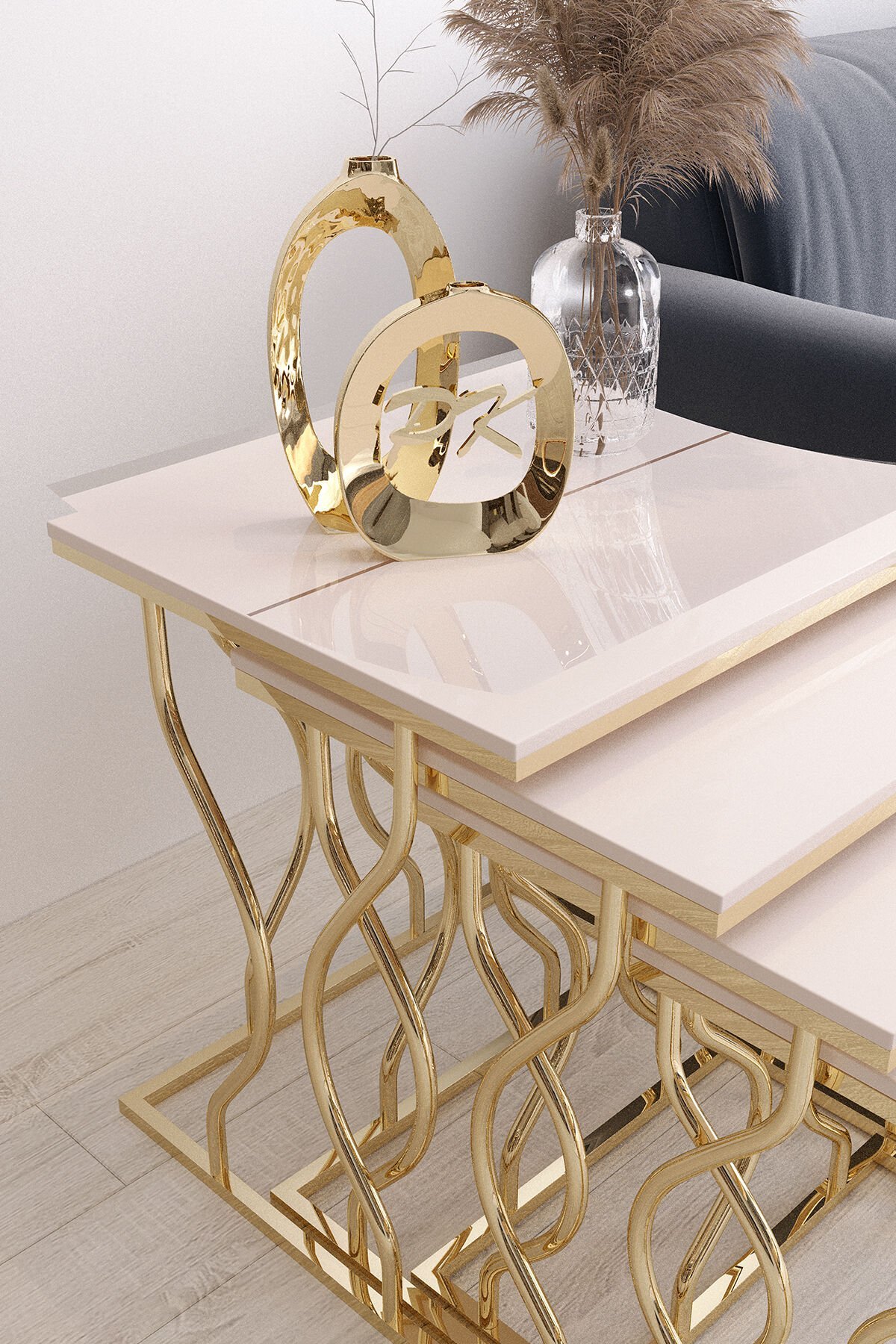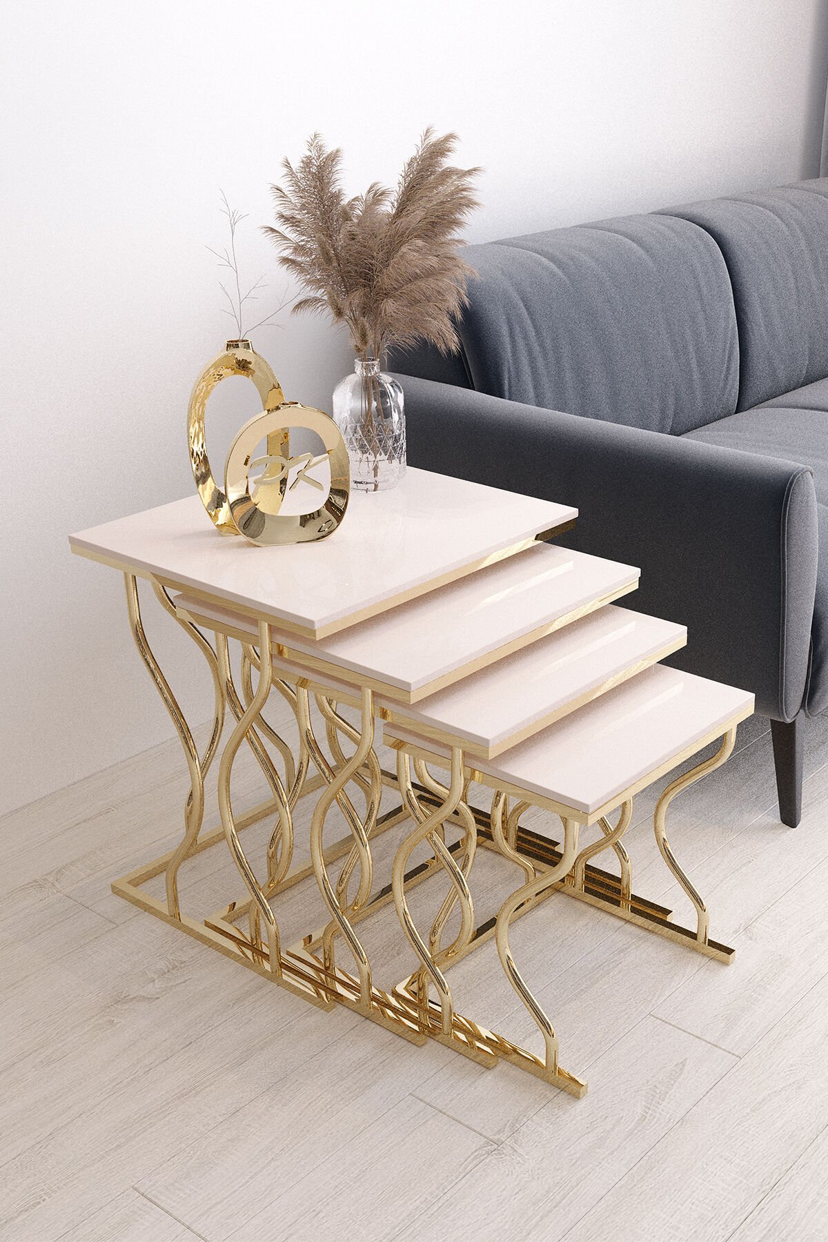 Hayal 4'lü Kare Zigon Sehpa Seti Gold Ayak, Krem Mdf