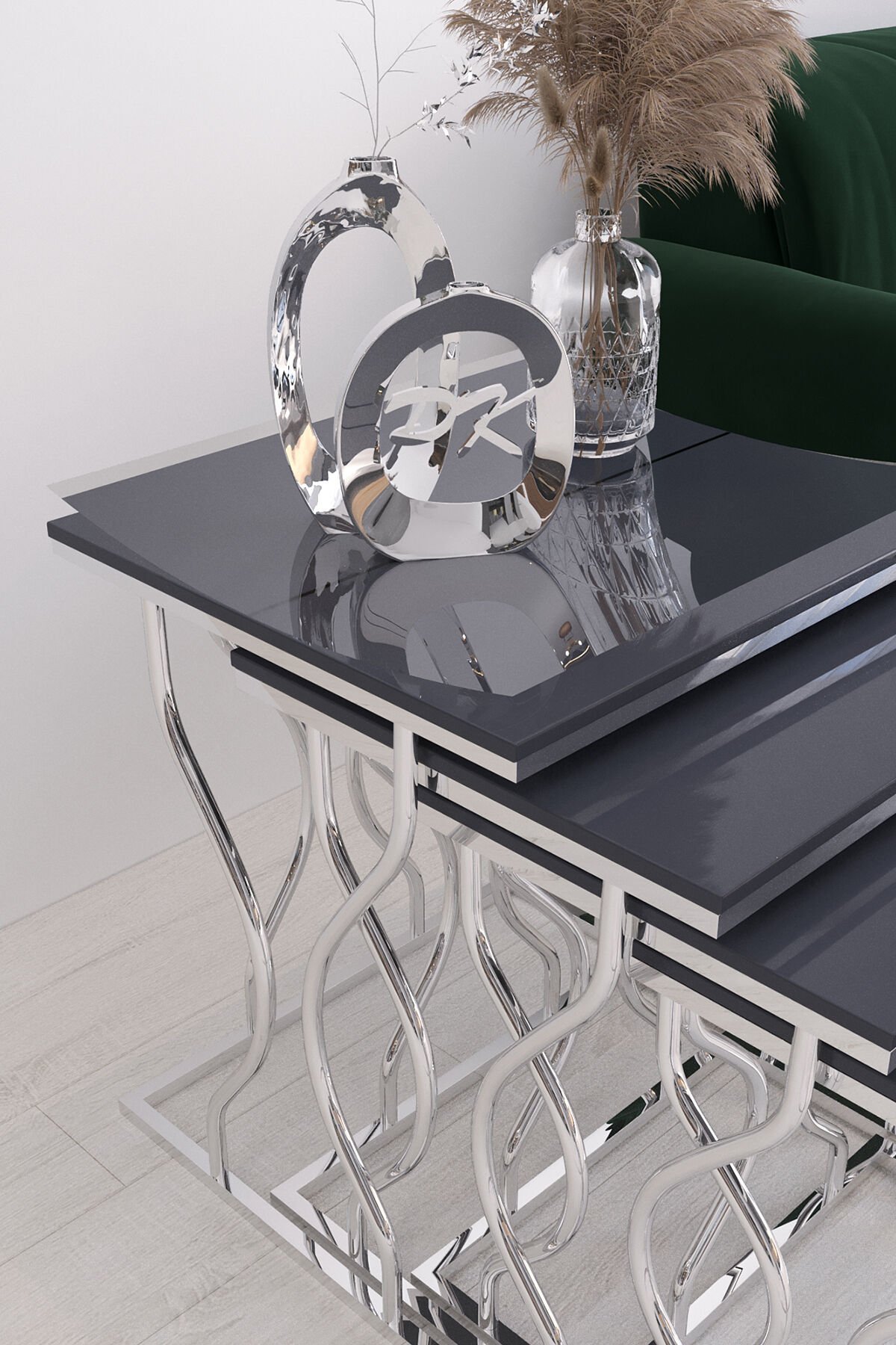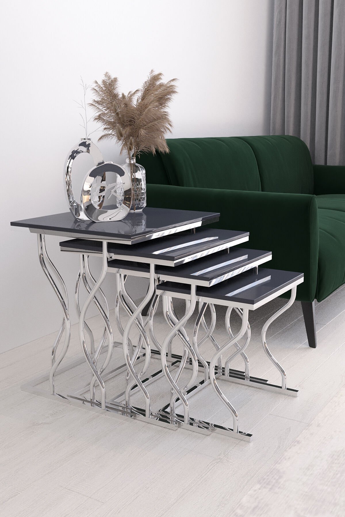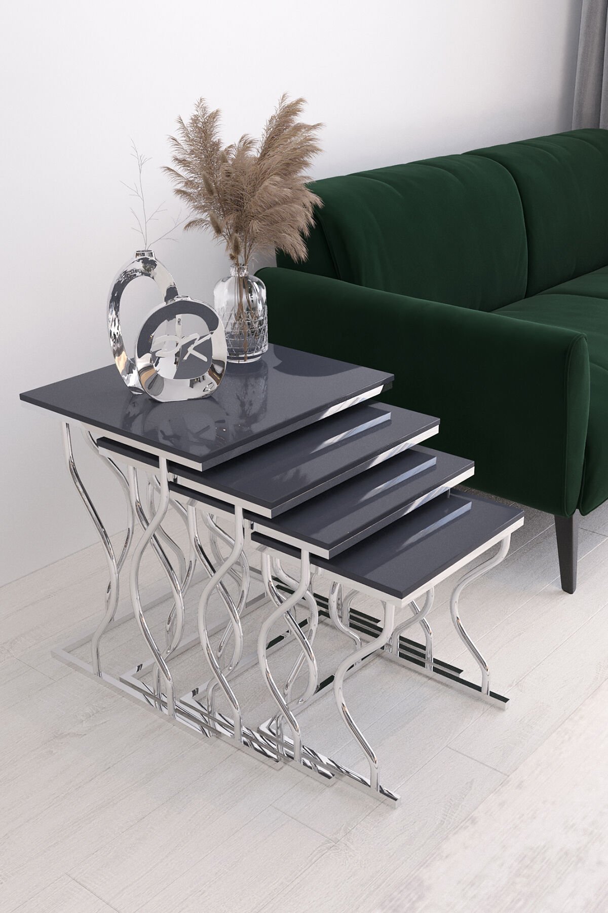 Hayal 4'lü Kare Zigon Sehpa Seti Gümüş Ayak, Antrasit Mdf